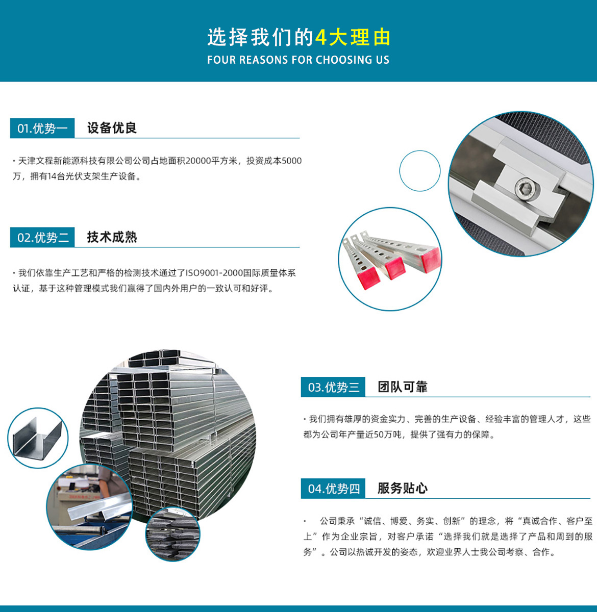 天津文程新能源科技有限公司成立于2021年,是專注于集中式、分布式、漁光互補(bǔ)和農(nóng)光互補(bǔ)等清潔能源發(fā)電的綜合性企業(yè) 公司是集設(shè)計(jì)、研發(fā)、生產(chǎn)、制造為一體的綜合型企業(yè)。公司占地面積20000平方米,注冊資金5000萬元整。公司坐落于華北鋼鐵重鎮(zhèn)--大邱莊,距天津市區(qū)50公里、鄰104和205國道及京滬高速,交通十分便捷。 本公司擁有三個生產(chǎn)車間,其中兩個冷彎型鋼車間,一個鋅鋁鎂型鋼車間,擁有自動冷彎成型機(jī)10條,自動數(shù)控沖孔機(jī)10條以及焊接加工等設(shè)備。主要生產(chǎn)產(chǎn)品有:太陽能光伏支架、各種規(guī)格的C/Z/U型鋼、抗震支架、管廊支架及整套配件等。